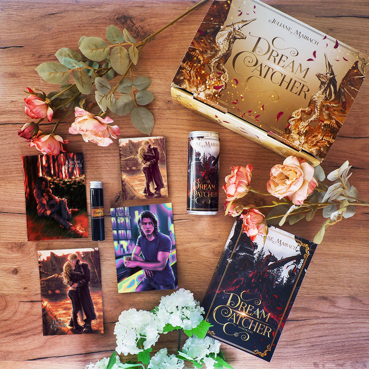 - 1 Softcover „Dreamcatcher – Shadowfall mit Gold Veredelungen, 3D UV-Lack und farbigem Buchschnitt.